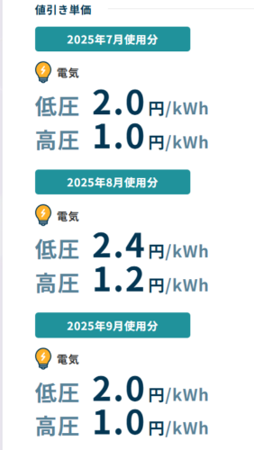 ①2025年7月・9月使用分 電気料金:低圧1キロワットアワーあたり2.0円、高圧1キロワットアワーあたり1.0円