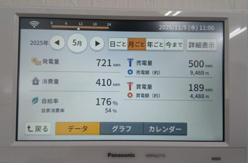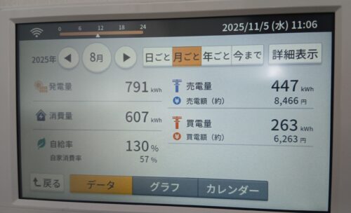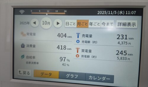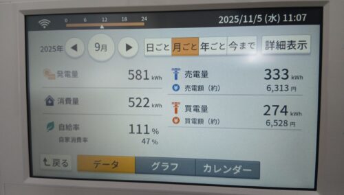 7月・8月・9月は発電はありますがエアコンなどの消費も多く、自給率がだいぶ下がってきました。ですが、まだまだ自給率は100%を超えていますね(^^)/