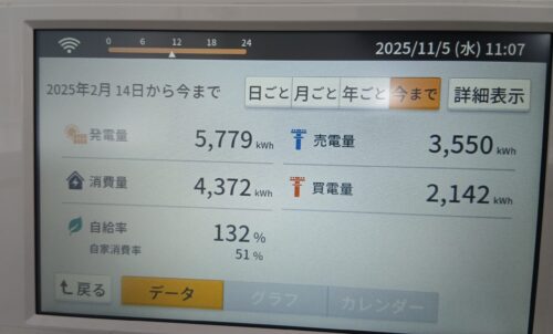 2/14~11/5までのトータルで見ると、自給率が132%で消費を発電が大きく上回っています。売電へ3550kwh回っていますので優秀だと思います。