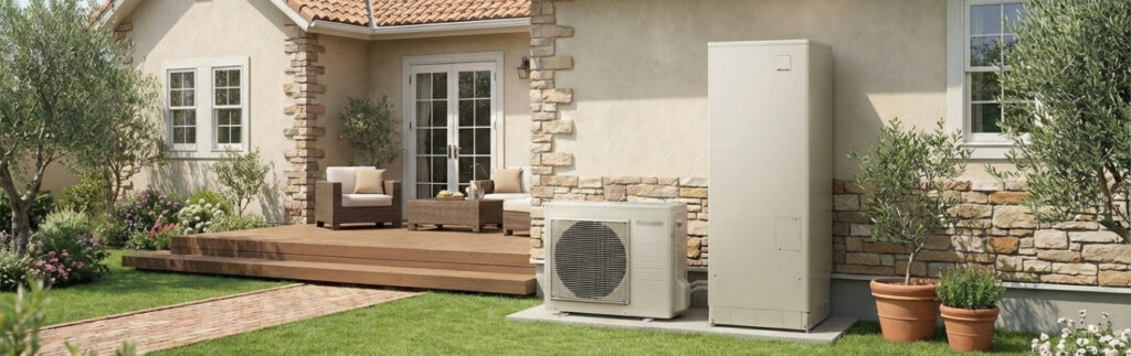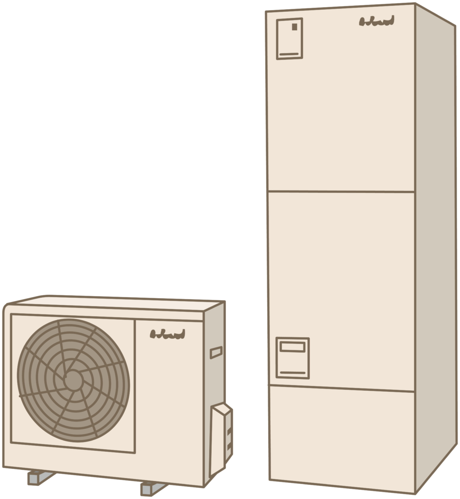 エコキュートとは、ヒートポンプ技術によって空気の熱を利用し、お湯を沸かす家庭用給湯システムです。