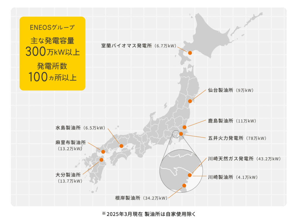 ENEOSグループとしては全国に100か所以上の発電所を有し、ENEOSでんきの事業を含む多様な事業に活用しています。これらの発電容量は300万kWに達します。ENEOSグループはこれらのノウハウを結集し連携しており、